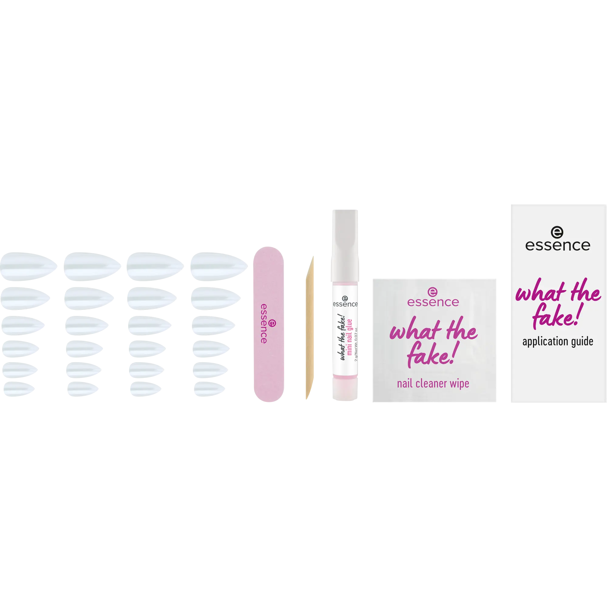 Content: 24 nails, glue, file, manicure stick and cleaning wipe.
