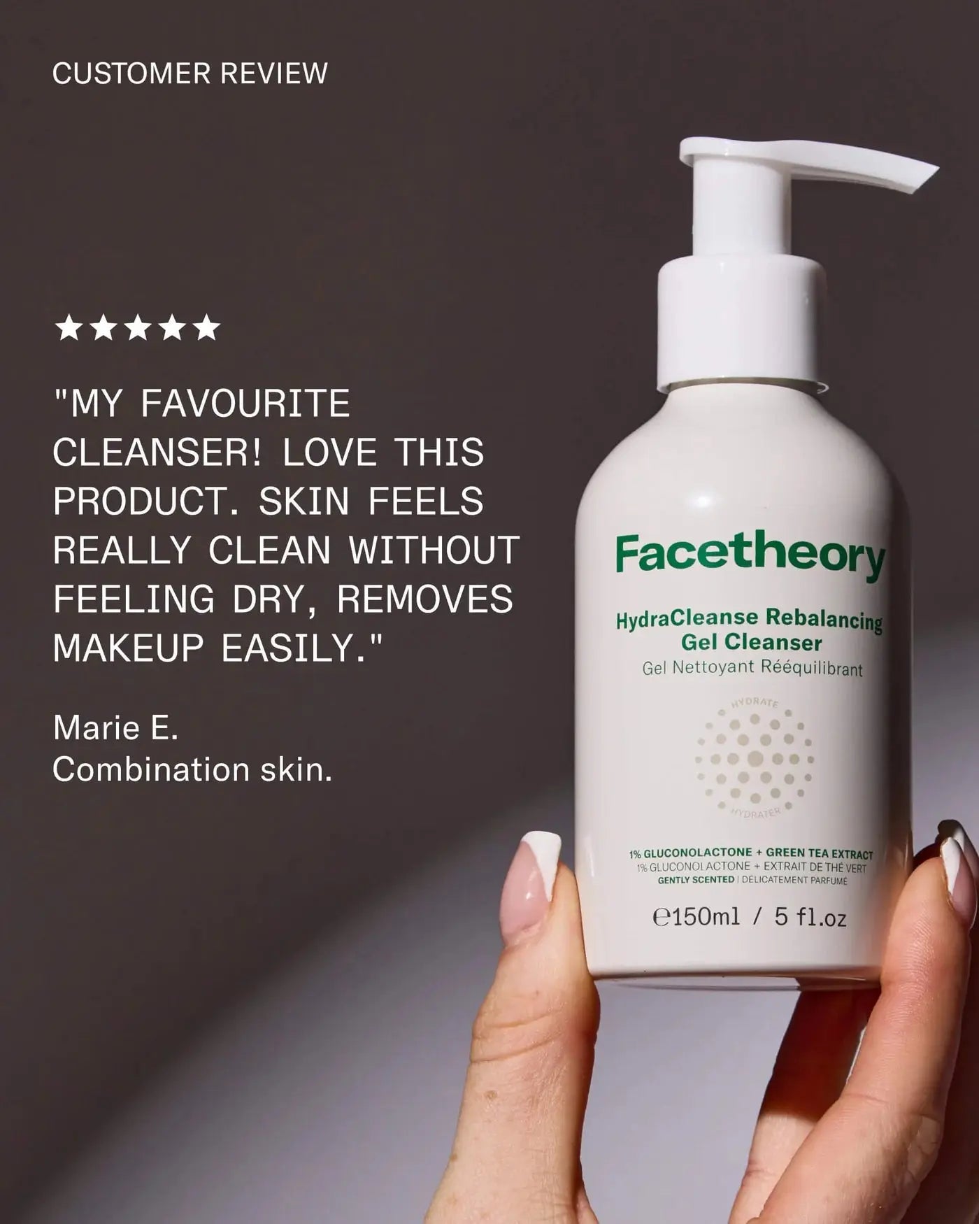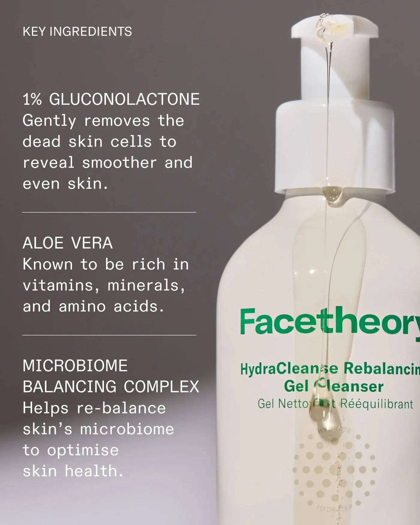 The Facetheory HydraCleanse Rebalancing Gel Cleanser Unscented is your gentle yet effective cleanser for fresh, balanced skin. This mild gel cleanser lightly foams and removes impurities without drying out your skin or disrupting its natural moisture balance. Perfect for daily use, even for the most sensitive skin.