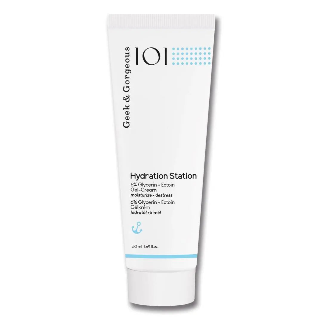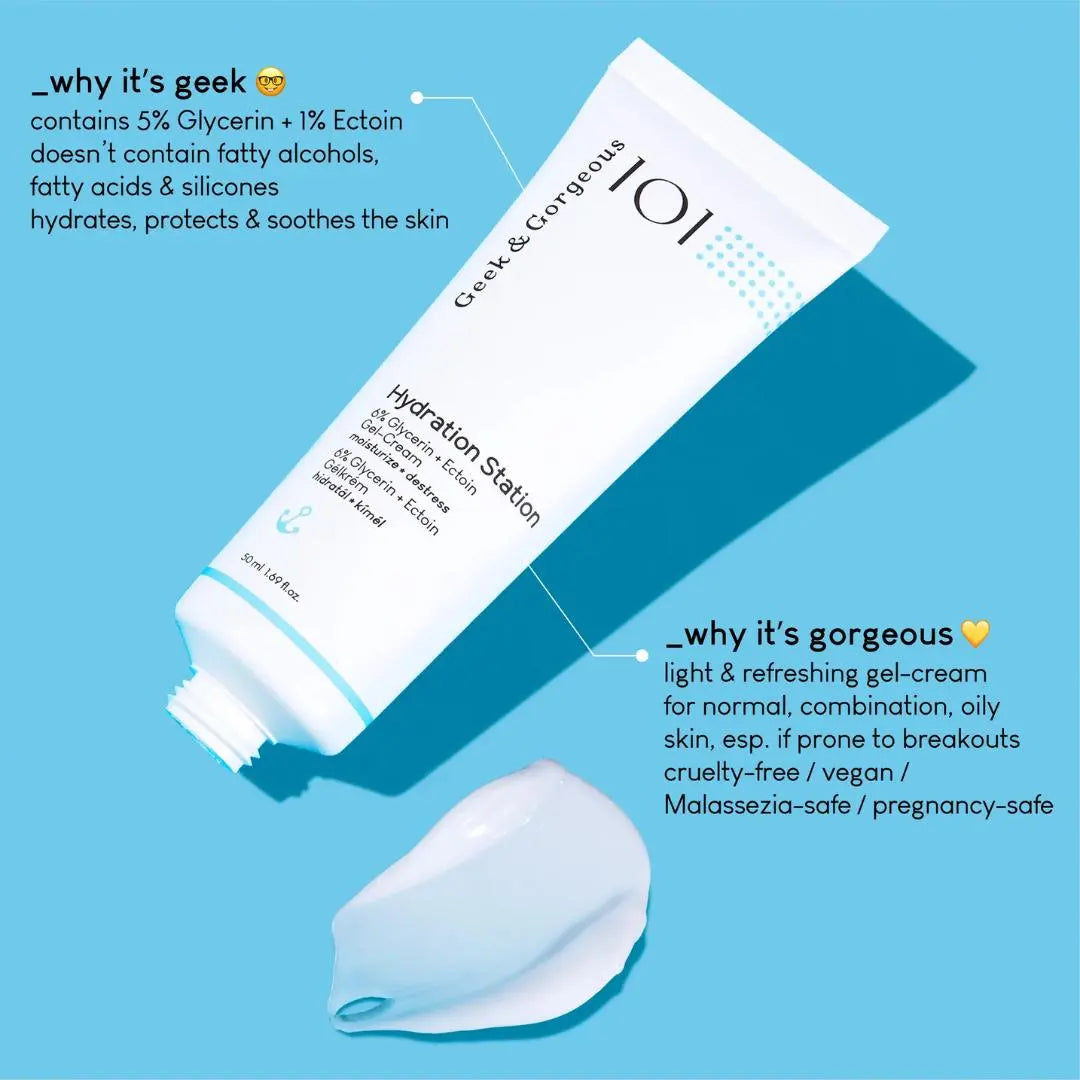 The Geek & Gorgeous Hydration Station is the perfect moisturizer for normal to blemished skin! This is a day cream that has been specially developed for everyone who suffers from break outs with normal moisturizers. The cream has a wonderfully cooling gel texture that will nourish and soothe your skin!