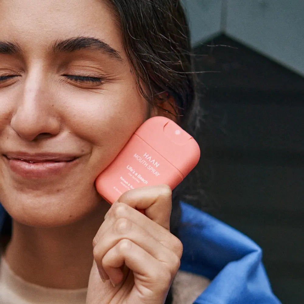 The Haan Mouthspray Life's A Beach is the perfect way to refresh your breath and boost your mood. This mouth spray delivers a refreshing experience with every spritz, thanks to the delightful combination of Chai Tea and Mint. It ensures you always feel confident, with fresh breath that not only refreshes but also enhances your mood.