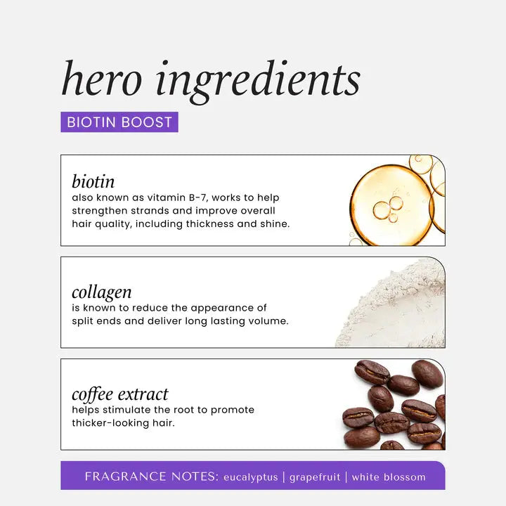 Aqua/Water/Eau, Glycerin, Biotin*, Hydrolyzed Collagen*, Coffea Arabica (Coffee) Seed Oil*, Cetrimonium Chloride, Polyimide-1, Polysorbate 20, Disodium Edta, Polyquaternium-22, Zea Mays (Corn) Starch, Polyquaternium-47, Sodium Benzoate, Sodium Salicylate, Potassium Hydroxide, Citric Acid, Parfum/fragrance, Citronellol, Eugenol, Geraniol, Hydroxycitronellal, Limonene, Linalool, Linalyl Acetate, Pogostemon Cablin Oil, Tetramethyl Acetyloctahydronaphthalenes (*tri-level Thickening Complex/complexe Épaississant Triple-action).