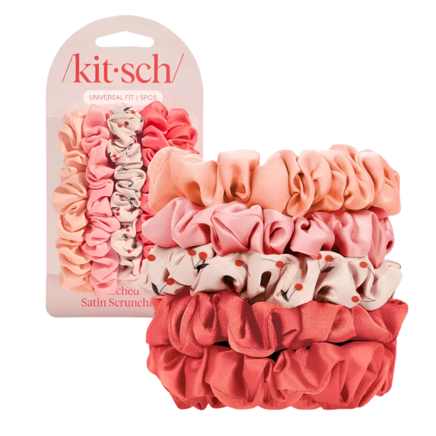 The Kitsch Ruched Satin Scrunchies 5pc Set Assorted Cherry Blossom is the ultimate gamechanger for your hair! These satin scrunchies aren’t just super cute with their soft cherry blossom print and neutral tones—they’re also incredibly gentle on your locks. No more dealing with elastics that break your hair or leave ugly creases—these beauties glide through your hair without causing damage. Perfect for both day and night, because we stay stylish 24/7!