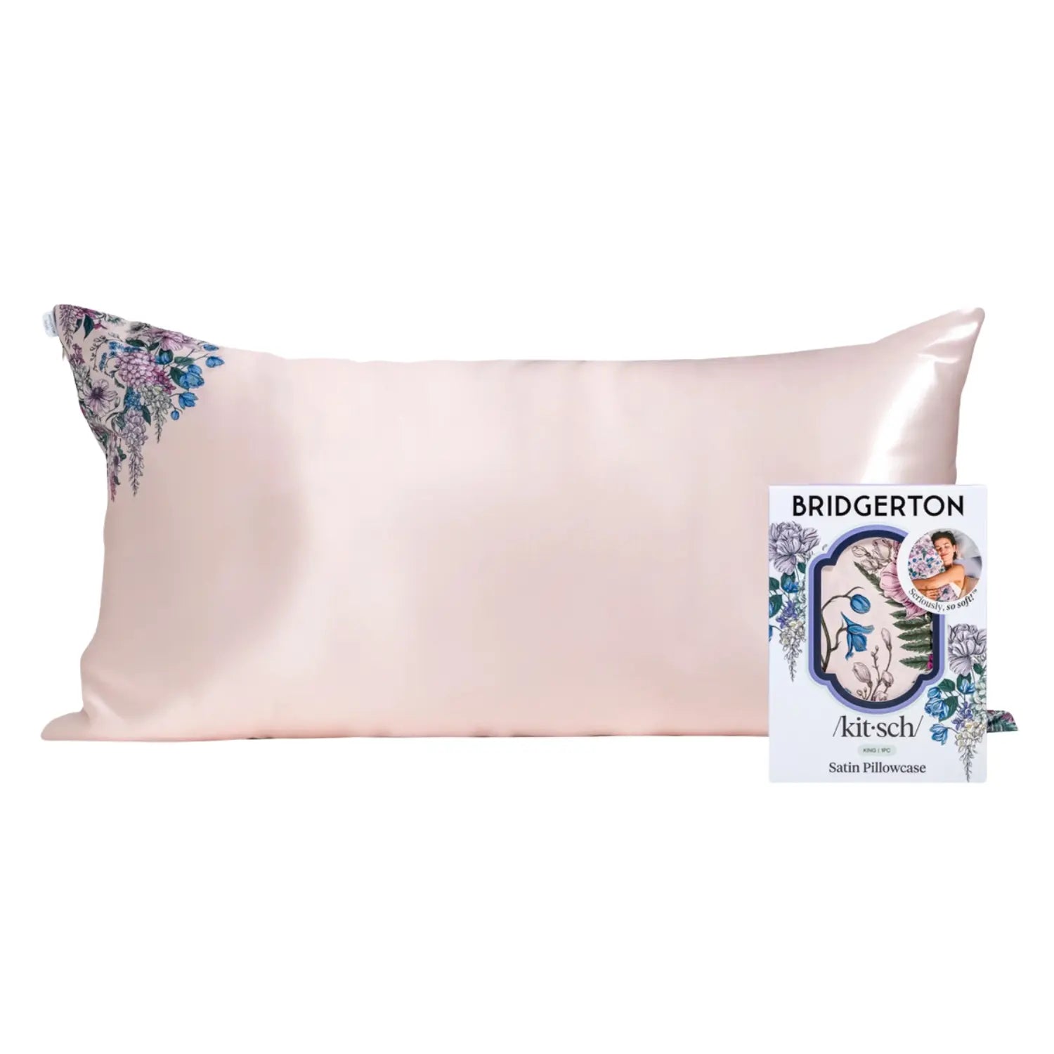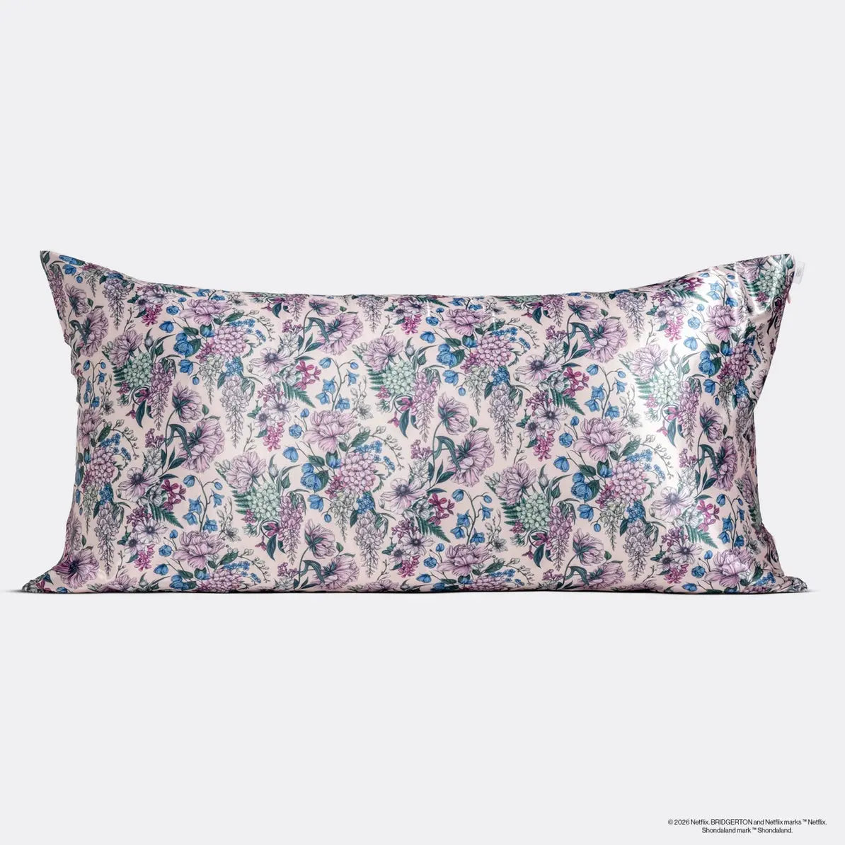The Kitsch x Bridgerton Satin Pillowcase Wisteria brings a touch of romance to your bedroom, straight from the Regency era. This satin pillowcase features a beautiful wisteria floral print on one side and an elegant floral trim on the other: perfect for switching up your mood. Stylish and functional!