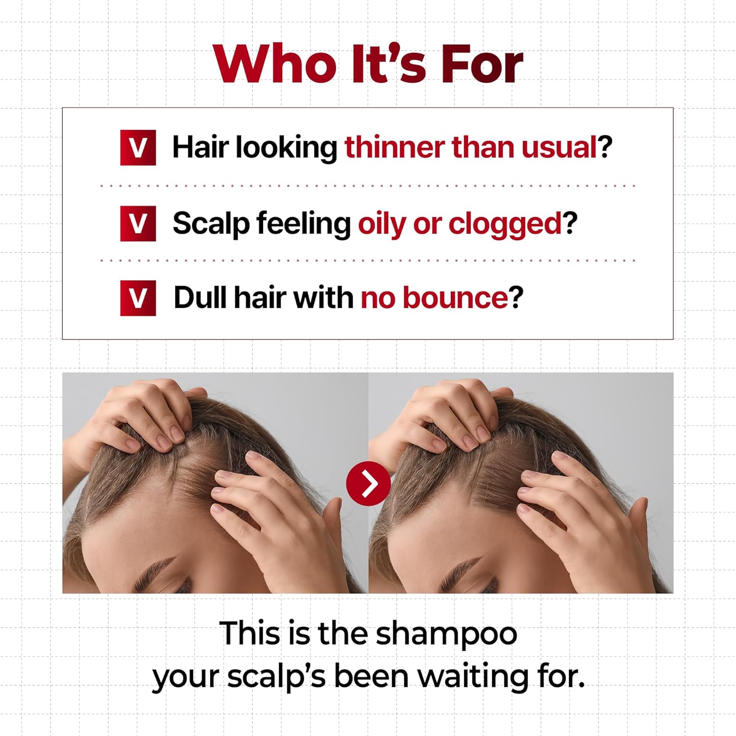 Water, Sodium Coco-Sulfate, Coco-Glucoside, Decyl Glucoside, Coco-Betaine, Caffeine, Glycerin, Soduim Chloride, Ziziphus Jujuba Fruit Extract, Angelica Gigas Extract, Morus Alba Bark Extract, Glycine Max (Soybean) Seed Extract, Portulaca Oleracea Extract, Polygonum Multiflorum Root Extract, Asarum Sieboldii Root Extract, Sophora Flavescens Root Extract, Thuja Occidentalis Leaf Extract, Lycium Chinense Fruit Extract, Ginkgo Biloba Leaf Extract, Carthamus Tinctorius (Safflower) Flower Extract, Hydrolyzed Collagen, Diospyros Kaki Fruit Extract, Camellia Japonica Leaf Extract, Ceratonia Siliqua (Carob) Fruit Extract, Rheum Palmatum Root Extract, Dioscorea Japonica Root Extract, Ulmus Davidiana Root Extract, Lithospermum Erythrorhizon Root Extract, Camellia Sinensis Leaf Extract, Glycyrrhiza Glabra (Licorice) Root Extract, Panax Ginseng Root Extract, Cordyceps Sinensis Extract, Paeonia Lactiflora Root Extract, Menthol, Panthenol, Niacinamide, Allantoin, Betaine, Guar Hydroxypropyltrimonium Chloride, Caprylyl Glycol, Citric Acid, Sodium Gluconate, Dipotassium Glycyrrhizate, Butylene Glycol, Salicylic Acid, Propylene Glycol Laurate, Hydroxyacectophenone, Dipropylene Glycol, 1,2-Hexanediol, Fragrance.