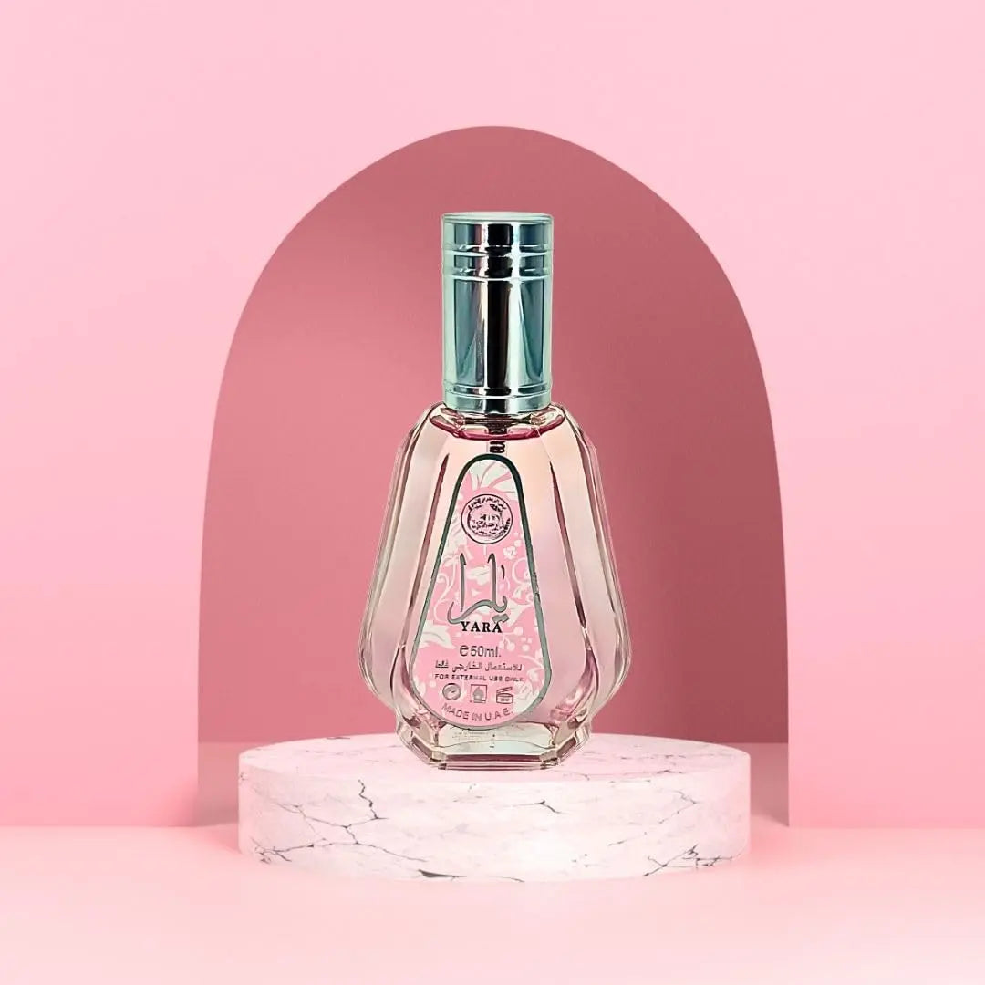 Yara opens with a soft blend of heliotrope, orchid, and a hint of mandarin. The heart reveals tropical fruits blended with creamy, sweet notes, creating a cloud of gourmand bliss. The base of vanilla, musk, and sandalwood adds a warm and cozy finish. Feminine, bold, and playful – this scent is a true compliment magnet.