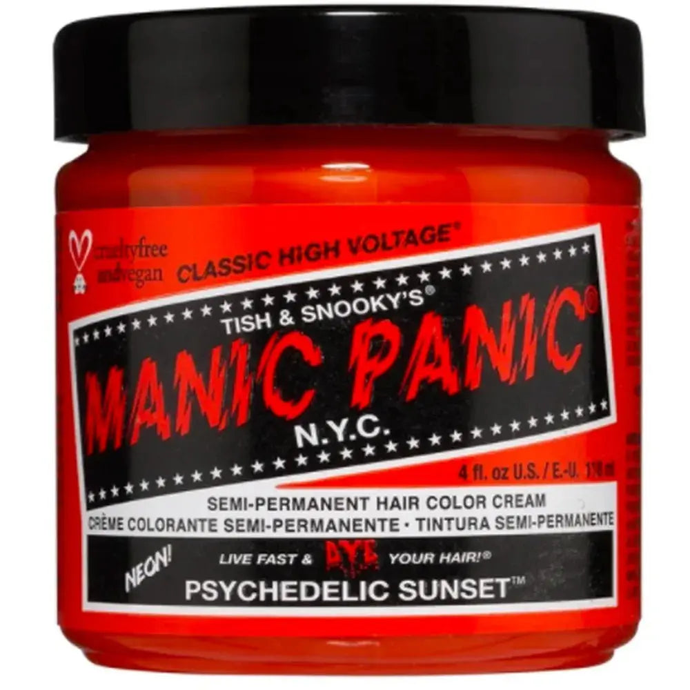 The Manic Panic Psychedelic Sunset Hair Color is a fiery neon orange shade that’s as hot as a California sunset! This bold, warm-toned hue is perfect for those who love to stand out. Apply to bleached hair (level 8 or lighter) for the most euphoric result. Think: festival vibes in a jar!