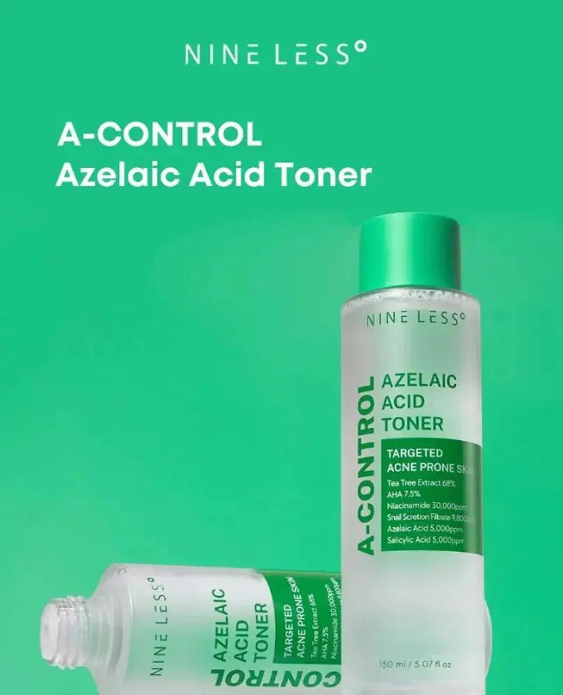 The Nine Less A-Control Azelaic Acid Toner is your new favorite toner if you struggle with blemishes, redness, or sensitive skin that needs some extra love. This exfoliating toner is packed with powerful ingredients like azelaic acid, tea tree leaf water, and AHAs to calm breakouts, keep pores clear, and restore balance to your skin.