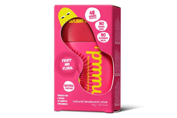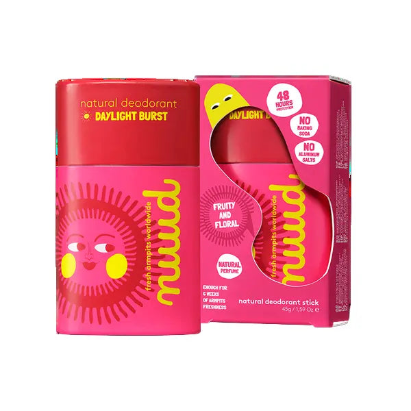 The Nuud Daylight Burst Stick is your daily dose of sunshine in a stick! With a refreshing blend of melon, lychee, and jasmine on a warm cloud of cashmere, amber, and sandalwood, this deodorant smells just as dreamy as it sounds.