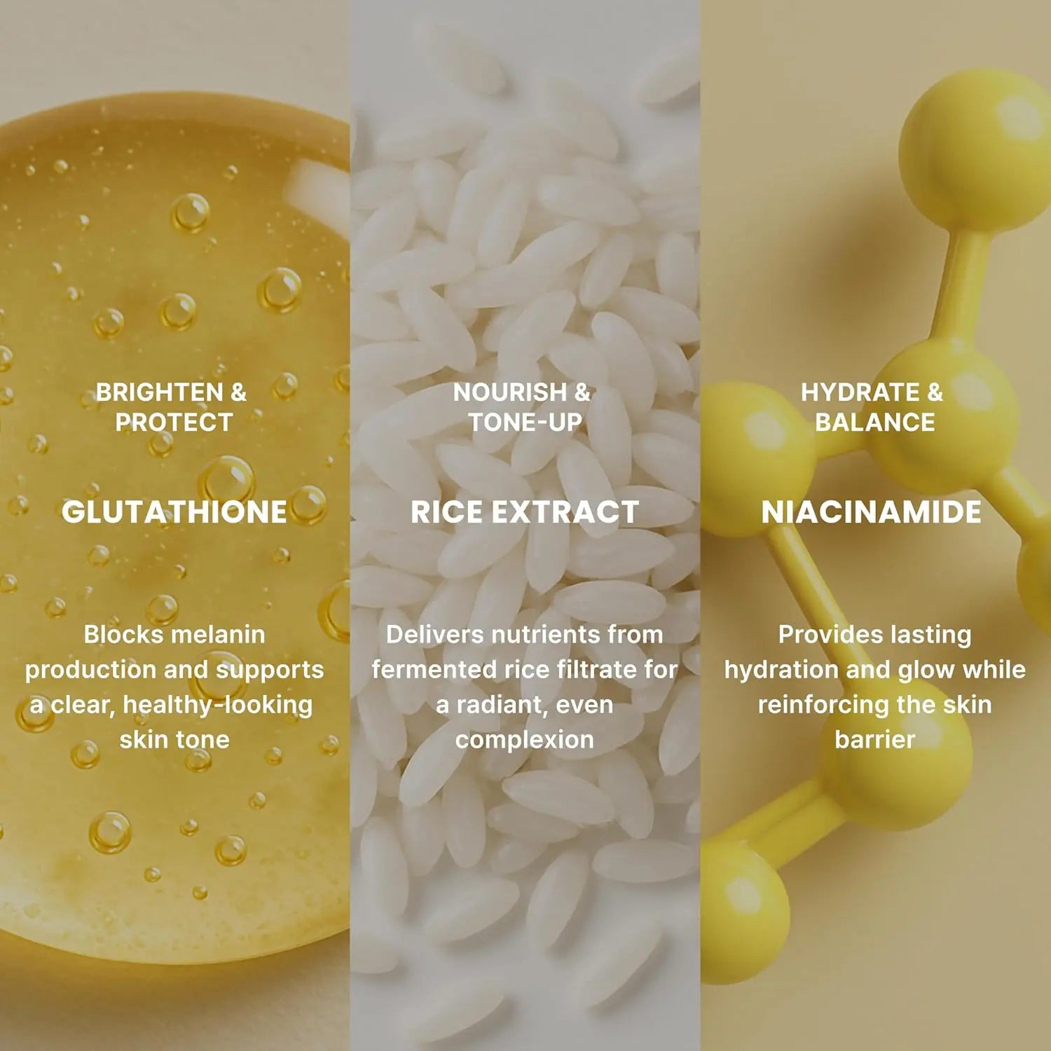 With Glutathione and Niacinamide, this mask helps create a more even and luminous complexion. Rice extract derived from fermented rice intensely nourishes the skin and promotes a healthy, clear look. Dark spots and redness appear visibly softened, while the skin feels calm and comfortable.