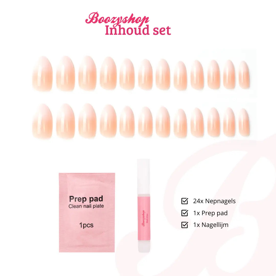 The Boozyshop Press On French Nails Ombre Nude are the perfect solution for beautiful nails in an instant. These artificial nails are not only stylish, but also have an ombre design that gives your nails an elegant and natural look. Treat yourself to a quick manicure with this set of press on nails, consisting of 24 pieces in 12 different sizes. Each nail is numbered from 0 to 11, which makes it easier to choose the most suitable size. This set also contains nail glue and a prep pad to optimally prepare your nails for long-term adhesion.