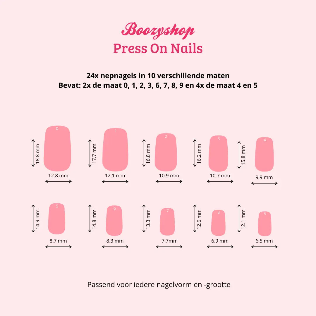 Whether you're looking for the timeless elegance of classic French nails or want to express your creativity with eye-catching nail art, Boozyshop has a wide range of press-on nails in various designs and colors. There’s always a style that suits you! Turn your nails into true works of art with our high-quality press-on nails.