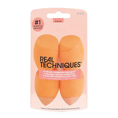 The Real Techniques 4 Miracle Complexion Sponges Advantage Pack contains four Miracle Complexion Sponges. This sponge is a multifunctional make-up sponge for applying foundation and concealer and for contouring around the nose and under the eyes. Before applying foundation or concealer, moisten the sponge first, so that not too much product is absorbed. Apply the foundation in a patting motion for best results.