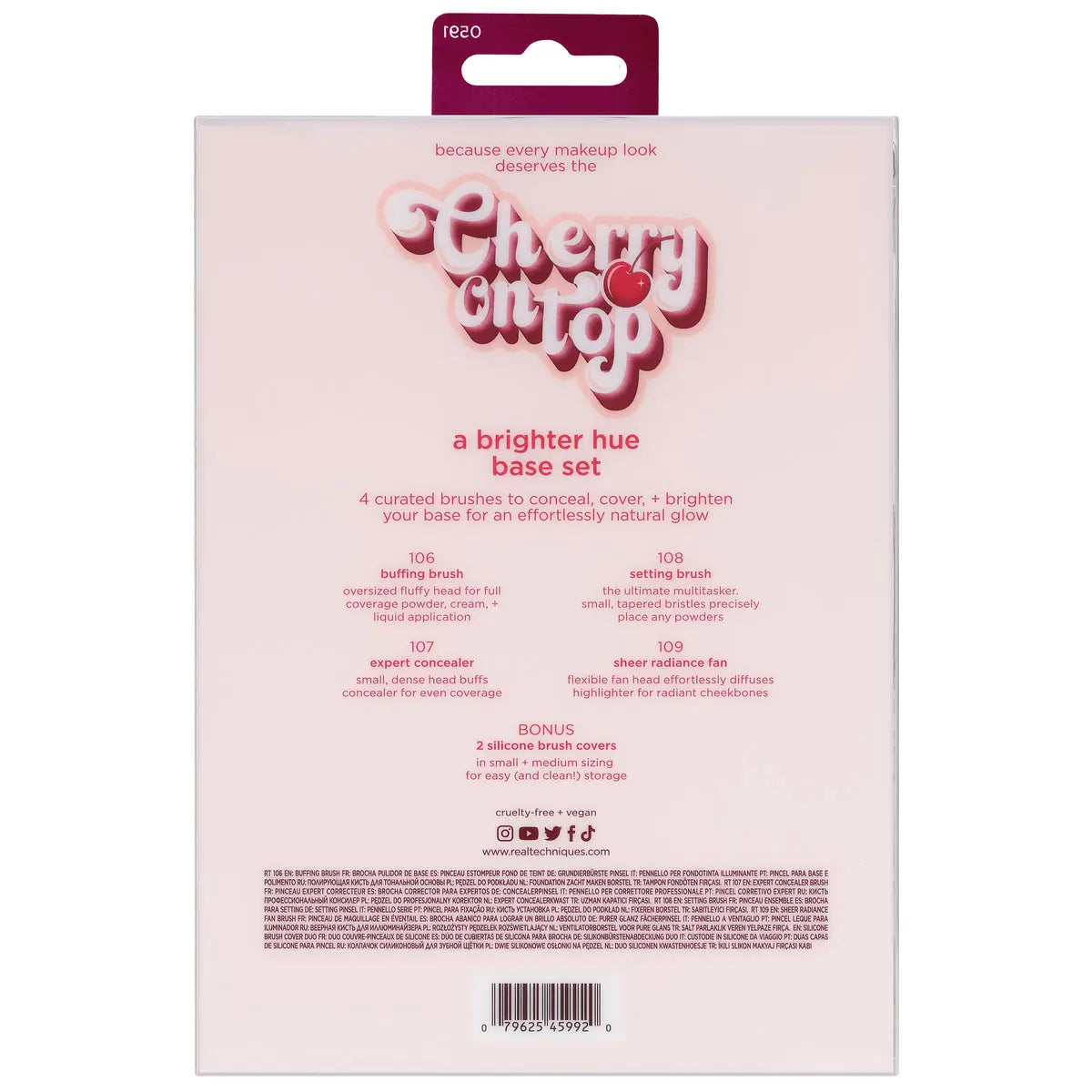 The Real Techniques Cherry On Top A Brighter Hue Base Set is your ultimate go-to for a flawless, radiant complexion! This limited edition set includes four multifunctional makeup brushes that allow you to effortlessly conceal, cover, and highlight for a natural glow. As a bonus, you get two silicone brush covers to keep your brushes clean and protected.