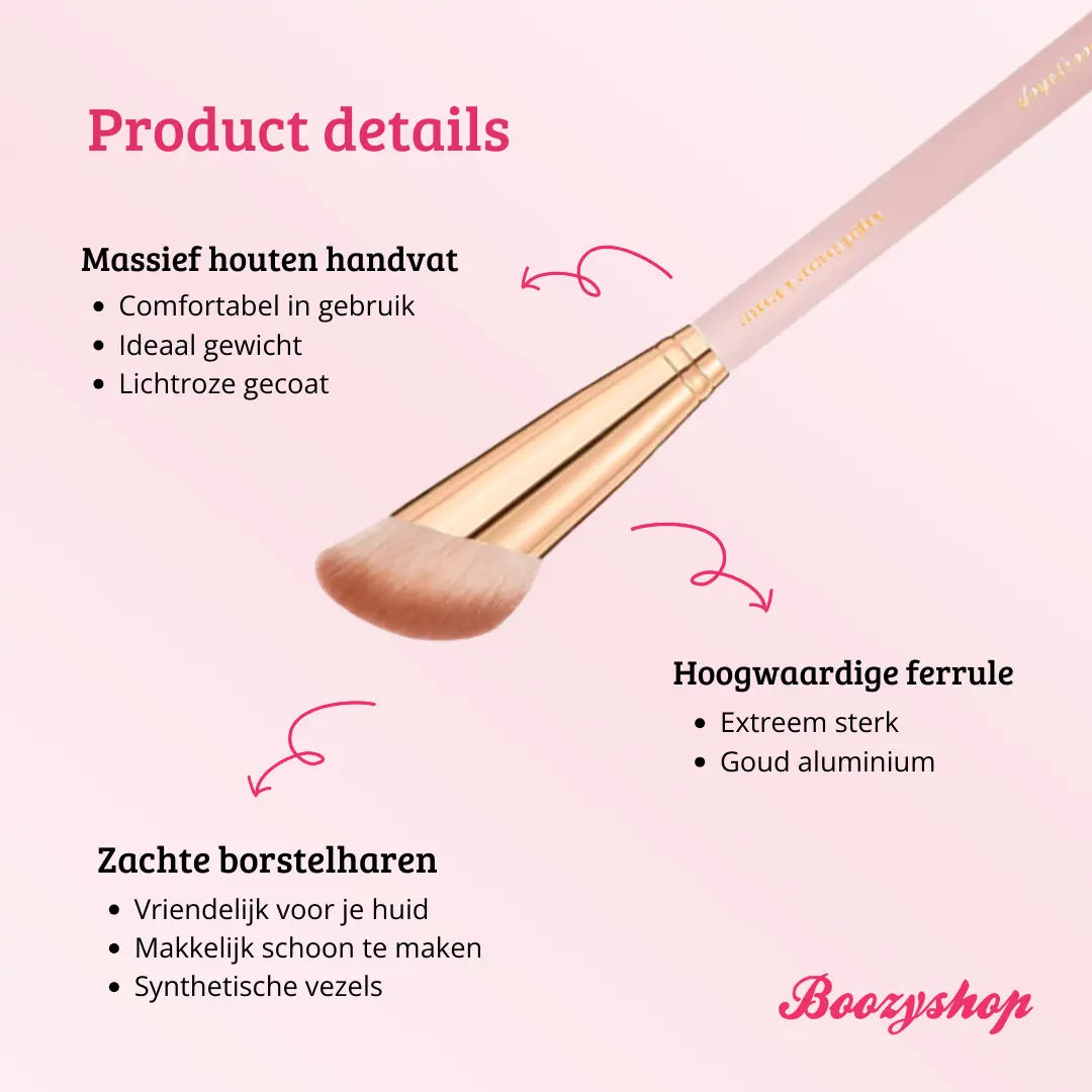The Boozyshop Soft Pink & Gold Angled Contour & Bronzer Brush is the ultimate makeup brush for evenly applying and blending your contour and bronzer. You can apply powder products effortlessly with this brush. The diagonally cut hair easily follows the contours of your face, allowing you to create that beautiful chiseled look.