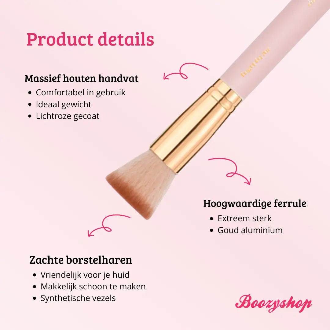 The Boozyshop Soft Pink & Gold Flat Top Buffing Brush is the ultimate makeup brush for applying liquid foundation. With this brush you can apply your foundation easily and quickly and blend it perfectly. Build up the coverage of your foundation by applying multiple layers. Thanks to the flat and precisely cut bristles, you can easily get a natural airbrushed effect.