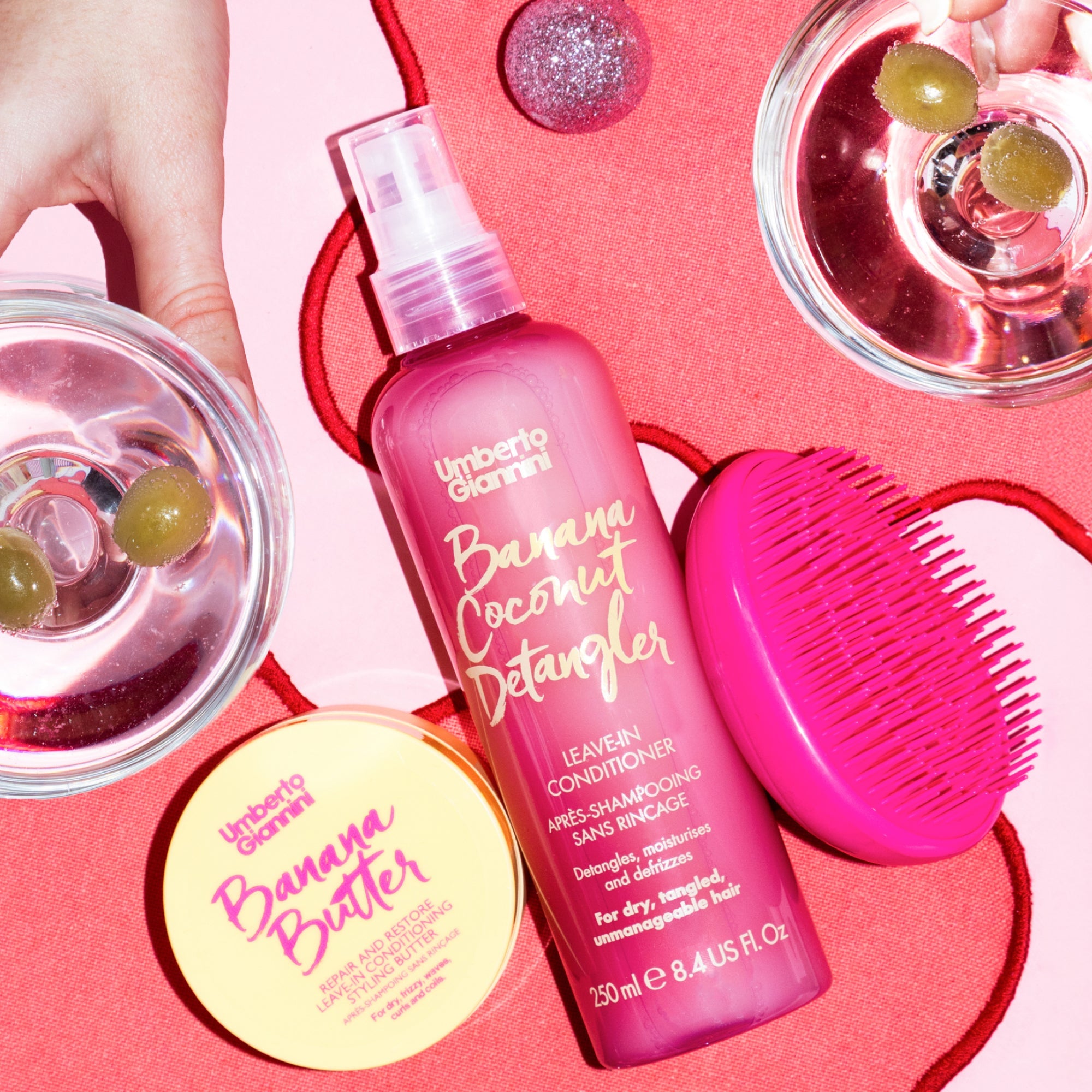 Banana Detangler (250 ml.): Water (Aqua), Amodimethicone, Polysorbate 20, Sodium Benzoate, Fragrance (Parfum), Cetrimonium Chloride, Trideceth-12, Polyquaternium-22, Citric Acid, Potassium Sorbate, Polyquaternium-11, Trisodium Ethylenediamine Disuccinate, Limonene, Glycerin, Phenoxyethanol, Carica Papaya (Papaya) Fruit Extract, Cocos Nucifera (Coconut) Fruit Extract, Ficus Carica (Fig) Fruit Extract, Garcinia Mangostana Fruit Extract, Mangifera Indica (Mango) Fruit Extract, Theobroma Cacao (Cocoa) Seed Extract, Coumarin, Musa Sapientum (Banana) Fruit Extract, Citral, Eugenol, Cinnamal, Ethylhexylglycerin.